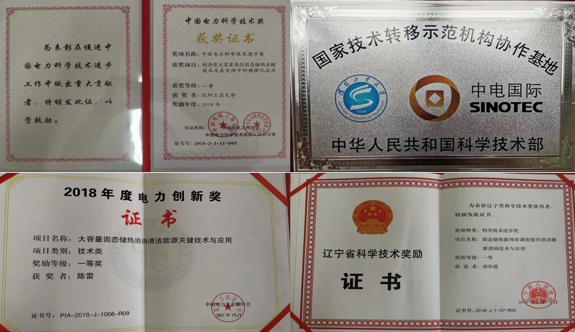 中电国际技术股份有限公司与沈阳工业大学新能源研究院是国家技术转移示范机构协作基地,肩负着国家技术转移的重任。其中固体蓄热储能技术已获得国家科学技术进步二等奖、辽宁省政府颁发的辽宁省科学技术进步奖一等奖、中国电力企业联合会颁发的2018年度电力创新奖一等奖、中国国机工程学会和中国电力科学技术奖励工作办公室颁发的中国电力科学技术进步奖一等奖等多项国家级奖项,
