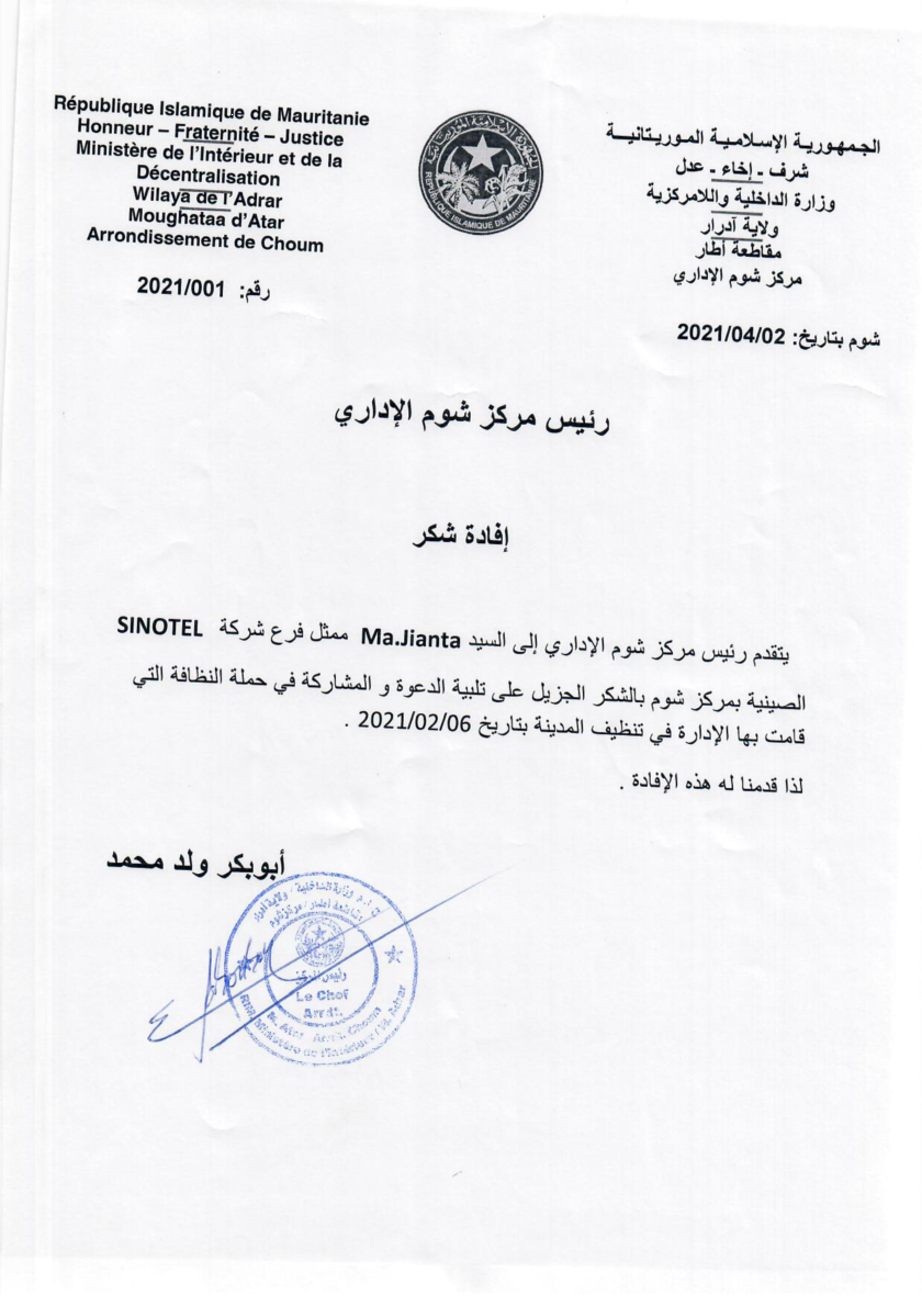 毛里塔尼亚使馆致公司的感谢信