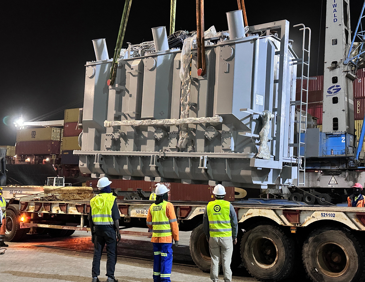 2025 年 4 月 23 日,我司毛里塔尼亚 LOT2 项目迎来重要进展,首批关键主设备顺利完成卸船,标志着项目建设迈入新阶段。本批设备包括 225kV 主变压器、电抗器等,总重超 800 吨。 面对体